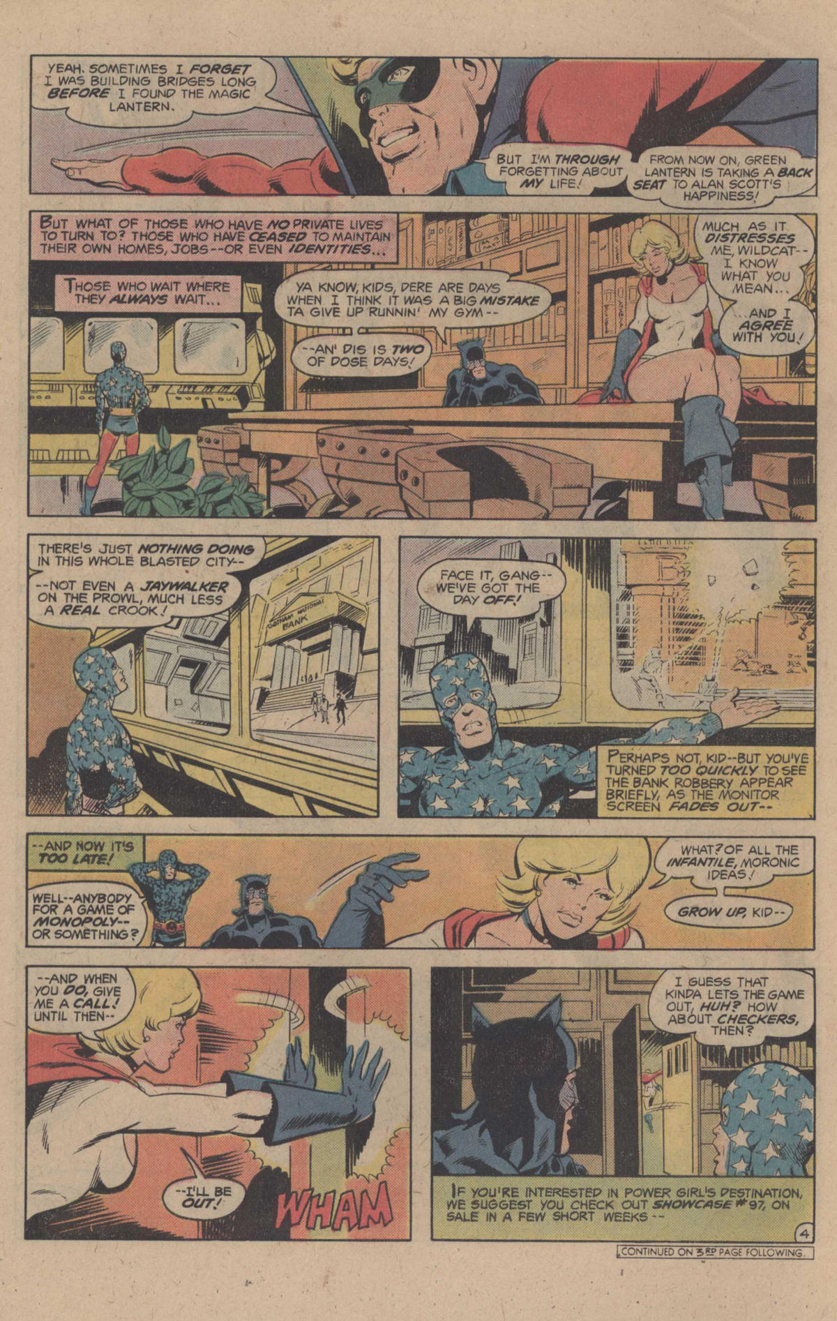 We start out with some bookkeeping, as the much-larger-than-usual grouping of Society members breaks up and goes their separate ways. This allows for some quick character beats–Commissioner Bruce Wayne apologizing to Power Girl for his past actions, the Flash offering the now-bankrupt Green Lantern a job at his lab in Keystone City, and so forth. At the end, only Wildcat, Star-Spangled Kid and Power Girl are left to mind the store–and Power Girl storms off when the Kid suggests they play Monopoly to pass the time. Actually, she’s off to go be in her solo appearances in the SHOWCASE book, another series that stopped showing up in my area.