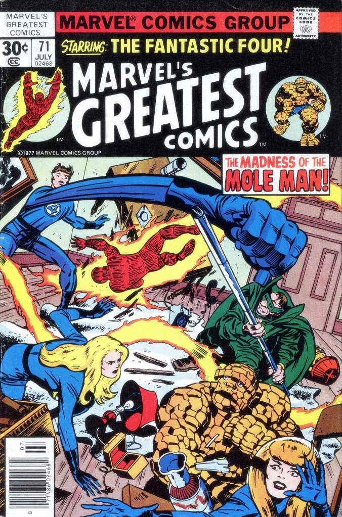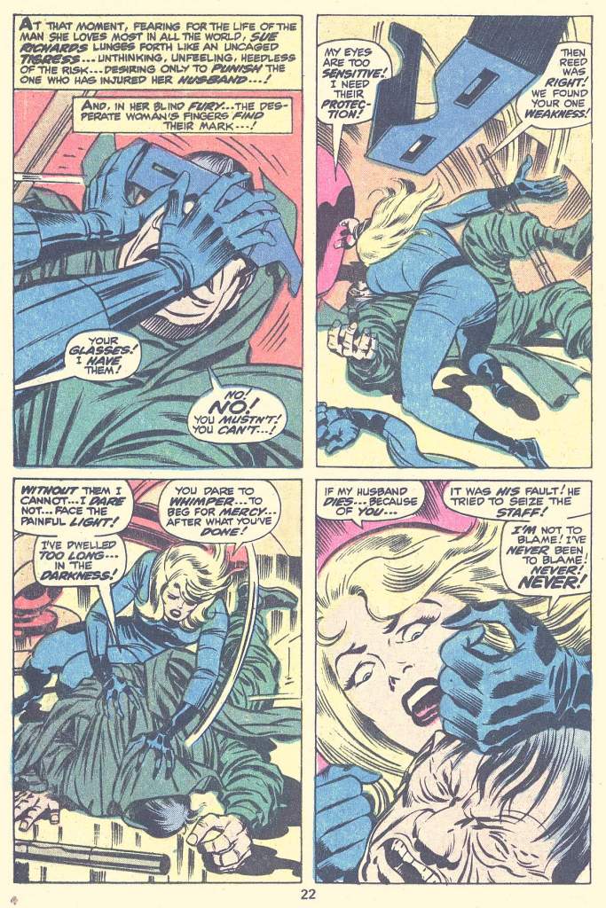 Kirby was also the king of kick-ass women, and so in the next moment, hearing her husband’s seeming death-cry, Sue Richards goes berserk. She grapples with the Mole Man, causing him to lose the protective glasses that shield his sensitive eyes from the light. Now everybody is on equal footing, and Sue beats the bejeezus out of the cringing Mole Man. The Torch shows up before the end to get in a couple of good licks, too–including one panel where his figure has clearly been redrawn by John Romita. But this is Sue’s moment.