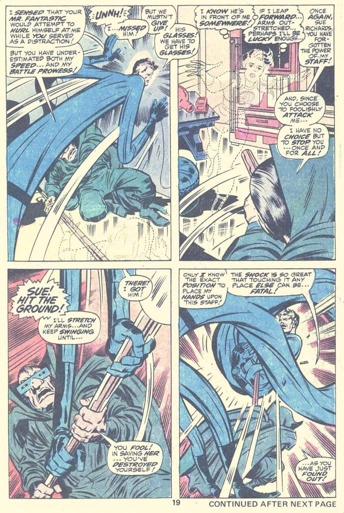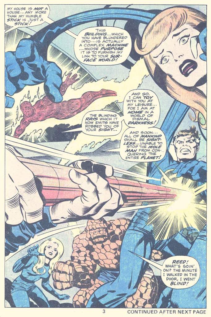 Back at the ranch house, the FF continue to struggle with their adversary despite the handicap of not being able to see. You would think this fight would be a cake walk for the Mole Man, but it turns out that our heroes are still fairly formidable even sightless. But ultimately, while trying to save Sue, Reed takes a full shock-discharge from the Mole Man’s staff at point blank range. Stan dialogues this sequence differently from how Kirby had obviously choreographed it–Stan introduces the idea that Reed grabbing the Mole Man’s staff in the wrong places electrifies him, but the visuals clearly show Reed grabbing the staff and pulling it upwards so it inadvertently faces him as it goes off. It’s a much more self-sacrificing moment as Kirby depicts it, but for whatever reason Stan chose to go another way with the moment, as he often did.