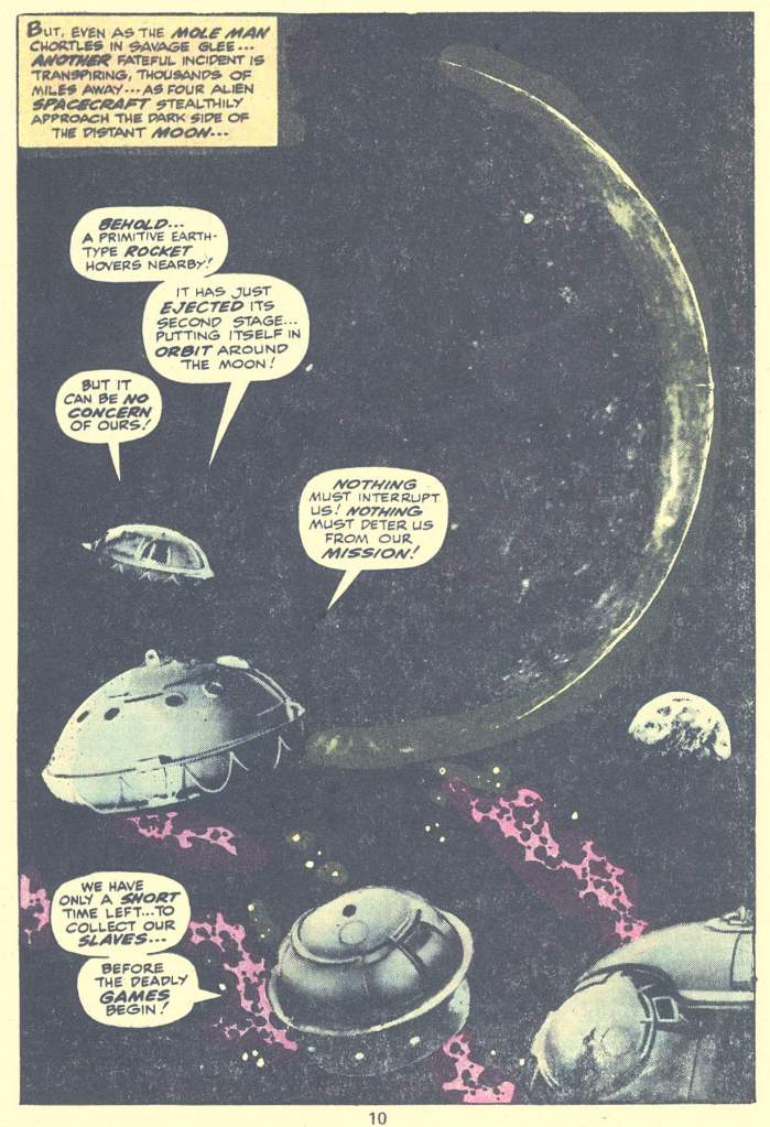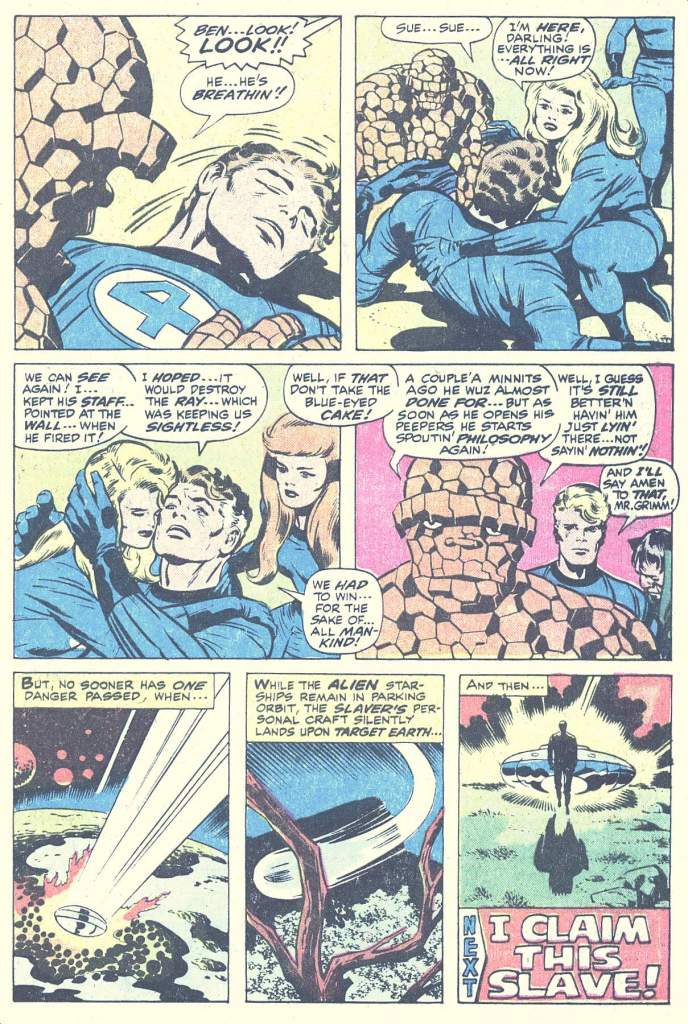 But Reed is still at death’s door, and it falls to the Thing to give him CPR and attempt to revive him. Which he does, of course–Reed wasn’t killed off in 1969, after all. And when he comes back around, Stan attempts to give him credit for the FF’s win by indicating that he’d deliberately pointed the Mole Man’s staff at the wall, trying to destroy the blindness-causing equipment in it. There’s no evidence of any of that in the art, but hey, let’s allow Reed his moment, shall we? Because elsewhere, as the story closes out, that saucer from earlier comes in for a landing on Earth, and its extraterrestrial inhabitant begins his hunt. To Be Continued!