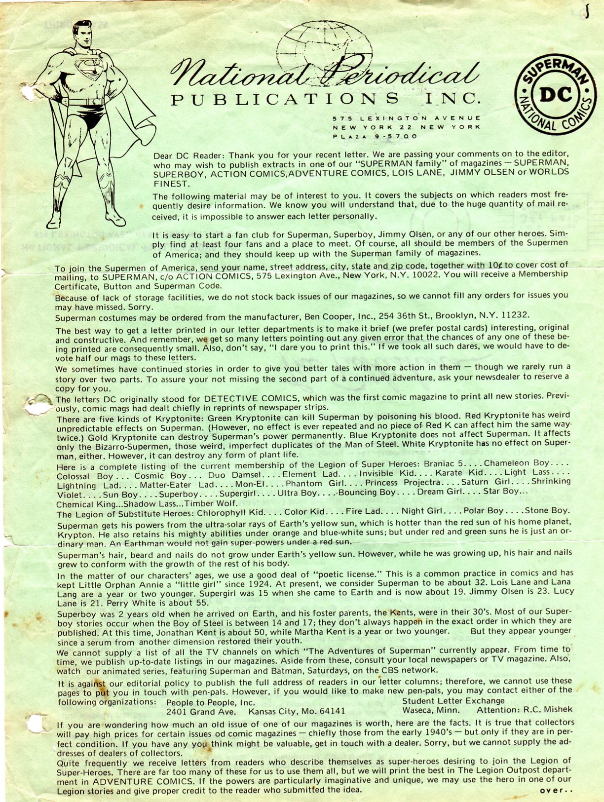 An example of the boiler plate letter that DC would send out in response to fan mail, which i received a copy of in 1974. This boiler plate was updated over the years, with information adjusted and changed. This example is from earlier, likely the late 1960s.