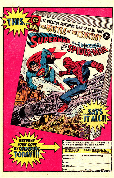THIS SAYS IT ALL! And it pretty much did. Even though I wasn’t a Marvel Comics reader in 1976 when SUPERMAN VS. THE AMAZING SPIDER-MAN was published, I nevertheless recognized it as something important, and so purchased a copy.