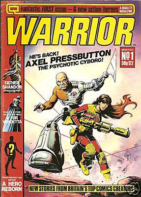 WARRIOR was a noble failure, an attempt to provide an alternative to the more kiddie-oriented fare that typically made up the British comic book scene. It was a heck of a nice package of material, featuring work by Alan Moore, Garry Leach, Steve Parkhouse, Dave Gibbons, John Bolton, David Lloyd, and Steve Dillon, among others. It was the home of the deconstructionist Marvelman, the dystopian V For Vendetta and the psychotic Laser Eraser & Pressbutton. In its own way, it was the precursor to the whole British invasion of American comics of the mid-80s, with material designed to appeal equally to both the British and American comics markets.