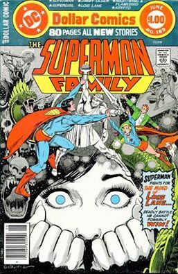 Here’s a nice SUPERMAN FAMILY cover by Jose Luis Garcia-Lopez. This one owes much of its success to the color choices. While the overall design is nice, it does become a bit cluttered. But by knocking out the background to a black and white monochrome and only using full color on the key figures, the image comes into focus nicely. Also, Lois’s blue eyes pull your focus in like a laser beam.