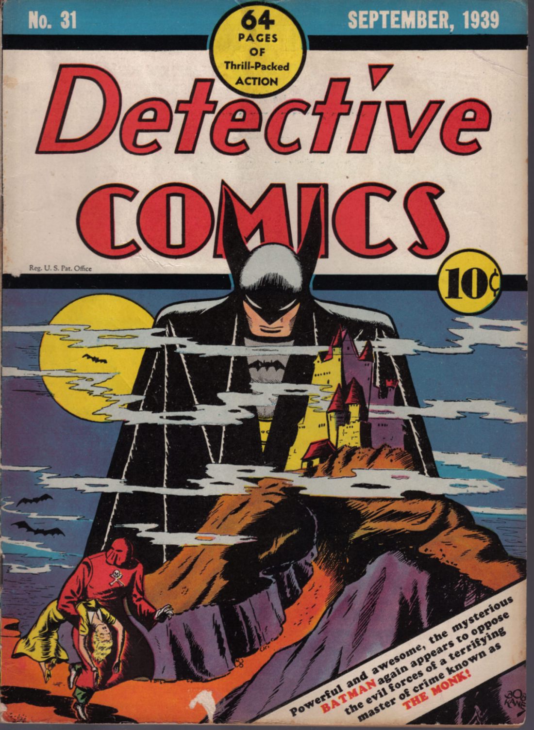 This cover to DETECTIVE COMICS #31, ostensibly by Bob Kane but likely also worked on by his earliest assistants such as Jerry Robinson and George Roussos, is a good example. The design is so strong and iconic that it’s been homaged a number of times over the years, and it completely succeeds in conveying the eerie mystery of this new Batman character. You could be forgiven for thinking him a villain in the mold of Dracula were it not for the cover copy exalting his appearing to oppose evil forces.