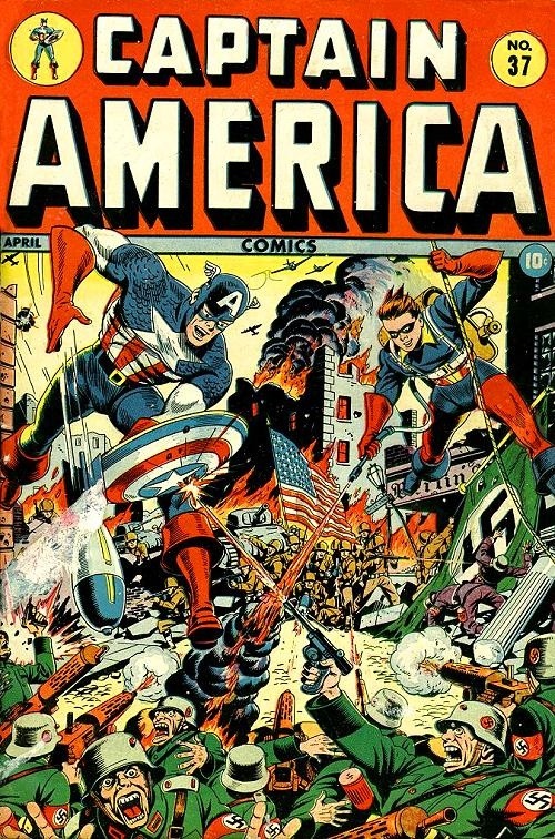 Look here at just how gleeful Captain America and Bucky are to be blowing the shit out of a horde of Nazi soldiers. Not bothering with a plane, Cap is dropping bombs by hand! Not to be outdone, Bucky is packing a flame-thrower, which he uses with glee. Covers like this one were clear war effort propaganda, but they’ve got such energy and animation to them–to say nothing of imagination–that they transcend their origins to become little works of art all by themselves.
