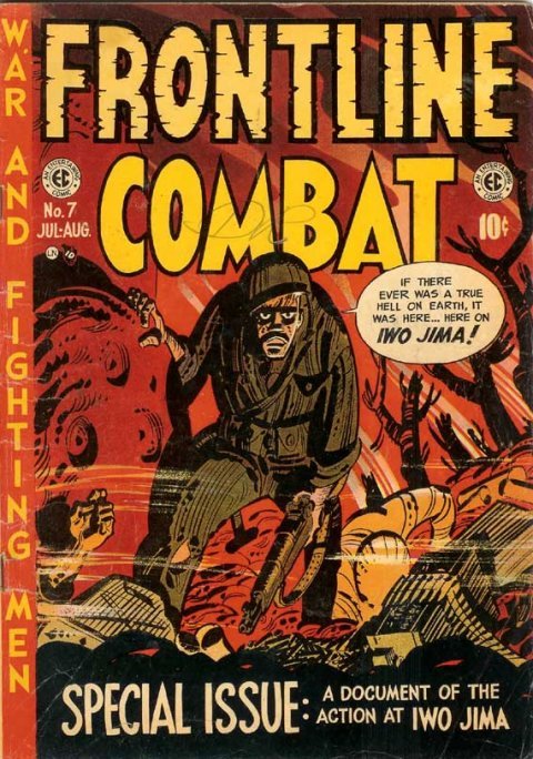 War comics often tended to have the best covers, but even among that field, this cover to FRONTLINE COMBAT #7 by Harvey Kurtzman is a stand-out. Far from the stark realism that most war covers strive for, Kurtzman’s trademark impressionistic style rather conveys the emotional weight of the moment. He’s drawing not so much what things look like so much as what they feel like–and that includes the central soldier.