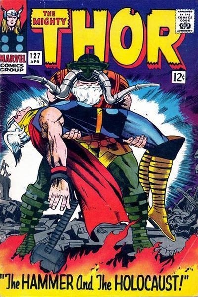 A much emulated Jack Kirby cover, this THOR image is the earliest example I can find of one hero holding the dead body of somebody else (though the pose comes out of classical sculpture and painting.)