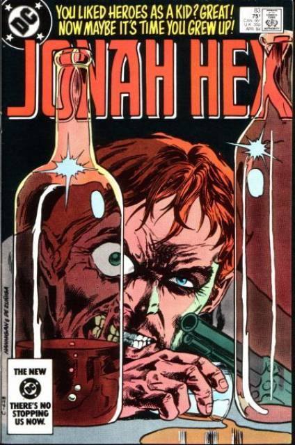 It’s really the cover copy that makes this Ed Hannigan JONAH HEX cover memorable. but that copy really works with the image, as does seeing Hex’s disfigurement exaggerated by the fish-eye lens of the booze-bottle. Even the fact that there’s a second, empty bottle off to the right provides more information. I also love the fact that the bottle-necks distort the logo behind them.