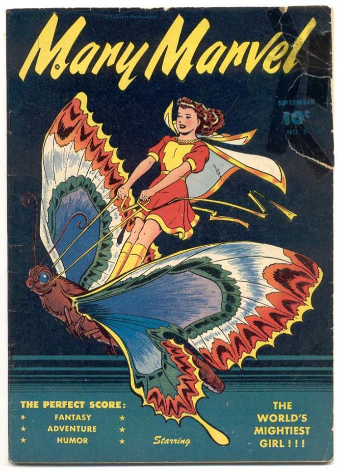 In terms of summing up a series in a single image, this Jack Binder MARY MARVEL cover is hard to beat. It’s elegant, whimsical, and has a strong element of fantasy to it. The black background tapering down to a deep midnight blue is attractive and helps to spotlight both the butterfly and Mary’s red and white costume.