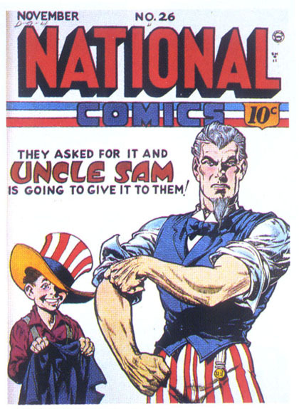 A super-simple patriotic cover by Lou Fine for NATIONAL COMICS, featuring Uncle Sam. This one could practically be the cover of an edition of the Saturday Evening Post, and evokes the classic James Montgomery Flagg image to good effect.