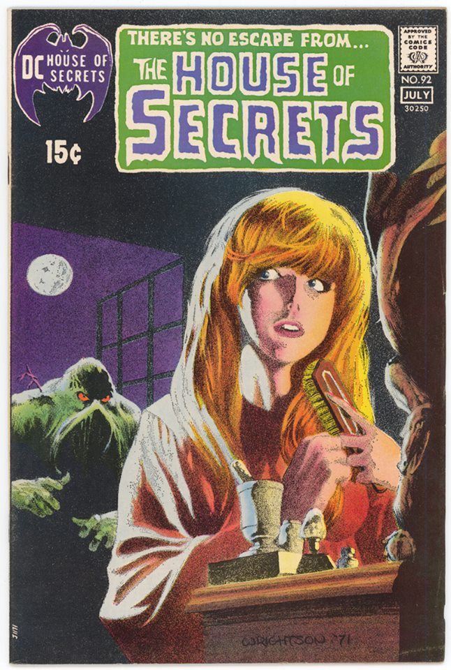 An admitted classic, this Bernie Wrightson HOUSE OF SECRETS cover on the first appearance of Swamp Thing is really worth a closer look. The tonework is subtle and immaculately done, and the image is composed elegantly. All of the elements work, including the sensitive coloring. As some people will already know, Wrightson used a lot of photo-reference and models in his work, and it was future writer and editor Louise Simonson who posed for the woman on this piece.