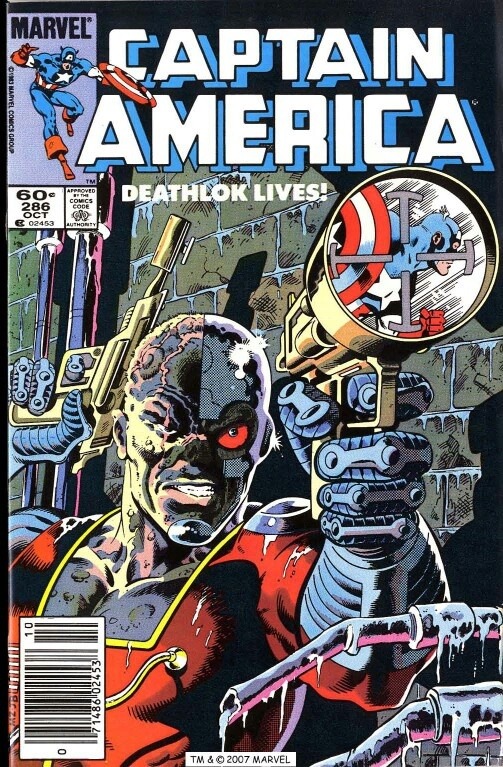 An often-homaged cover, this CAPTAIN AMERICA piece by Mike Zeck combines detail and composition into something of a synthesis of the approaches of Neal Adams and Jim Steranko. Deathlok’s red eye right at the center is focal point, and the diagonal of the gun and hand takes the viewer to the image of Captain America in the crosshairs.