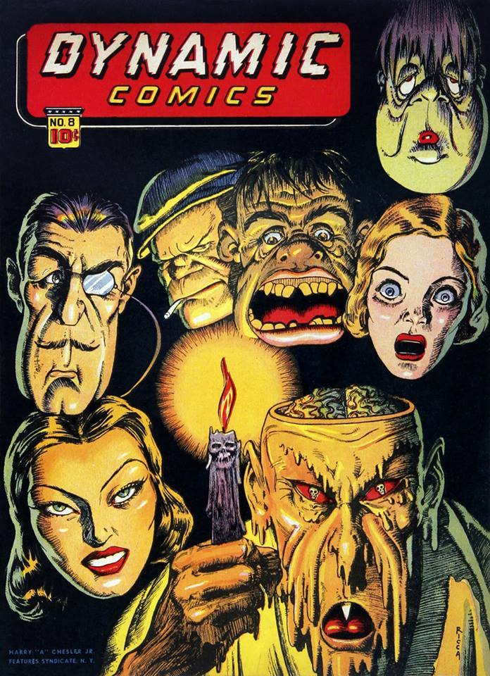 What a disturbing cover to this issue of DYNAMIC COMICS, by an artist named Gus Ricca. I know nothing about him, but these creepily caricatured faces are thoroughly attention-grabbing and horrific! What’s up with the guy in the foreground whose face melts like wax and whose skull has been cut off to expose his brain? Damned if i know–but I’m sure I would have opened the book to try to find out.