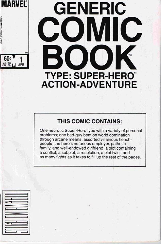 In terms of getting across the concept of a series, it would be difficult to top this cover to THE GENERIC COMIC BOOK by, well, nobody. It’s a perfect replica of the generic brand packaging of the era, and communicates exactly what the gag of this one-shot is all about in a way that any illustration wouldn’t be able to pull off.