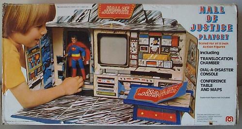 This was nowhere near as cool as the spinning transporter that was incorporated into the Enterprise set, nor the Bat-Poles and cave entrance in the Batcave set through which you could propel the Batmobile toy. Regardless, I loved this stupid thing. it had great Neal Adams artwork on the outside of it that included characters such as Green Lantern who never got an actual toy. And it used the shield from the JUSTICE LEAGUE OF AMERICA logo as a part of the HALL OF JUSTICE logo, which I appreciated.