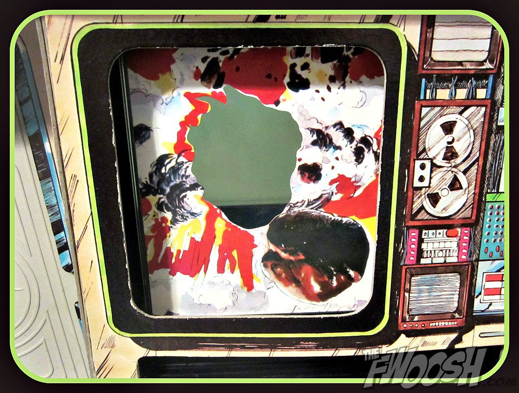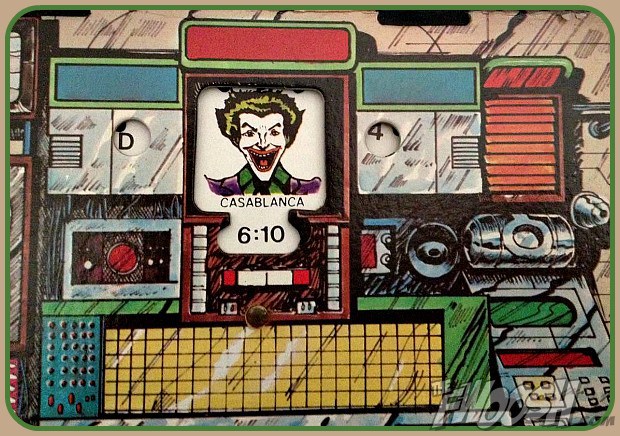 Like the other playsets of this era, it really is a cheap bit of work. Constructed primarily of vinyl over cardboard, the playset was relatively durable. As its main item, it came with a table around which your super heroes could assemble–the top of the table was actually a booklet of maps and images showcasing different crises around the world at which your heroes might be needed. It also came with a series of slide-in cards which would be visible through the clear window in the back wall. Each of these cards itself had a clear area in it. By placing your hero into the teleporter, you could slide him to the right, so that he appeared in the midst of the disaster seen upon the screen.