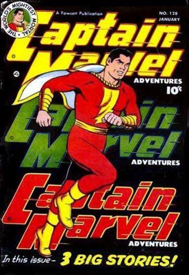 A super cool and graphic CAPTAIN MARVEL ADVENTURES cover by C.C. Beck. It’s a very simple idea–three logos to communicate the fact that there are three stories in the issue starring the Big Red Cheese. Again, good use of a black background to help provide contrast.