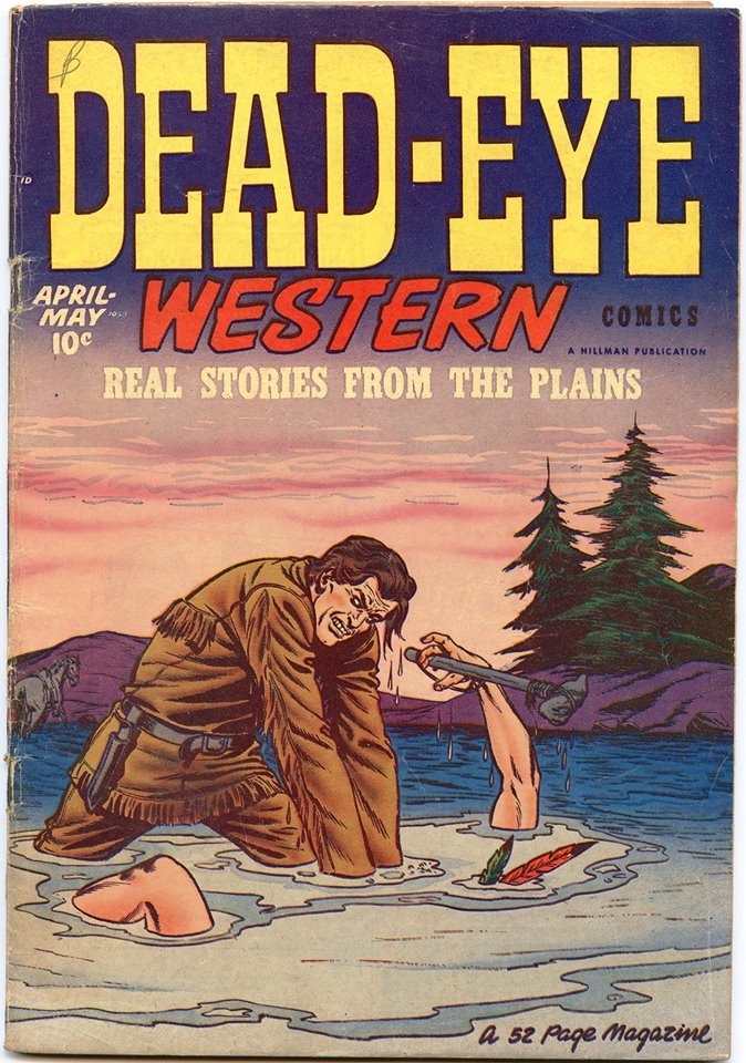 No idea offhand who drew this cover to DEAD-EYE WESTERN, but it certainly is dramatic as hell. Given his expression, it’s almost difficult to relate to the buckskin-wearing cowpoke who’s drowning that poor Indian as the good guy. The Grand Comics Database lists their best guess at the artist as being Dan Zolnerowich