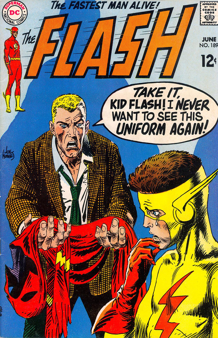 Nobody did covers of extreme emotionalism better than Joe Kubert, and this FLASH cover is a good example. It’s drenched in melodrama, the huge word balloon dripping with pathos. Great use of color pulls your eye to the Flash uniform in Barry Allen’s hands, and silhouettes crybaby Kid Flash very nicely. And the drama of the moment almost demands that you open the book to see what could have caused this to happen.