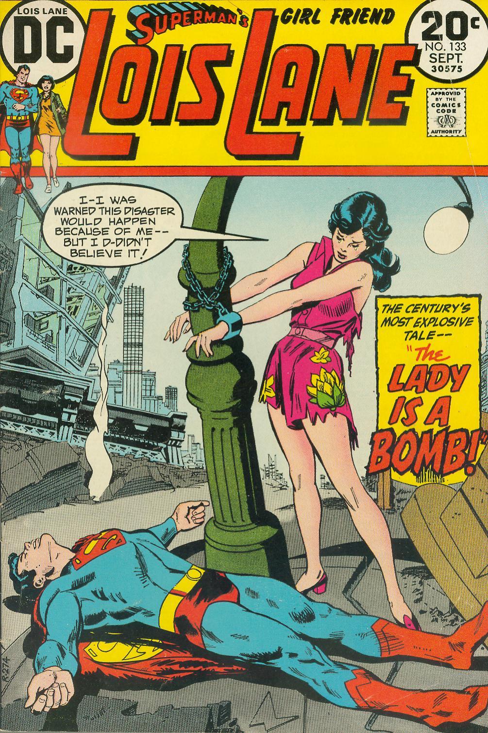 The story opens with Lois trying to get an interview with some musicians, disguising herself to gain access to their just-landed plane. Succeeding in this, the group lets Lois accompany them in their limo–which promptly goes off of a cliff. Superman appears to catch the plummeting auto, and Lois’s story is good enough that it beats out her rival-yet-friend Melba in Perry White’s eyes–convincing Perry to make Lois the acting editor of the Daily Planet while he goes on sabbatical. From there, Lois is accosted by Ronald Devon, a brilliant young scientist who has turned himself into a human bomb. He proceeds to handcuff himself to Lois, letting the world know that he will blow the two of them (and Metropolis as well-the explosive he has invented is that powerful) to smithereens if the person who betrayed him does not come forward. Problem is, Devon won’t name that person, so it’s up to Superman to suss out and interview all of the potential suspects, while Lois stalls Devon.