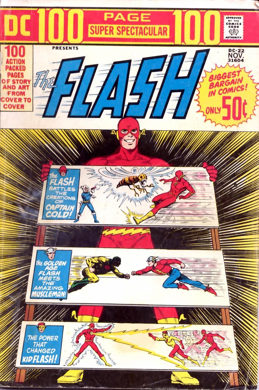 This first 100-Page Super-Spectacular was an excellent introduction to the character and his world, because it featured stories that included examples featuring most of the other key Flash-related heroes. The first story introduced me to Kid Flash, who started out as a smaller version of his mentor, but who got a sleek new costume in this story. I liked him, too.