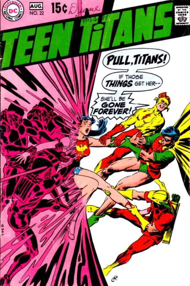A super-dramatic Nick Cardy TEEN TITANS cover, with excellent use of color. That magenta dimension just looks dangerous and weird and horrifying, and the desperate body language of the three male Titans sells the drama.