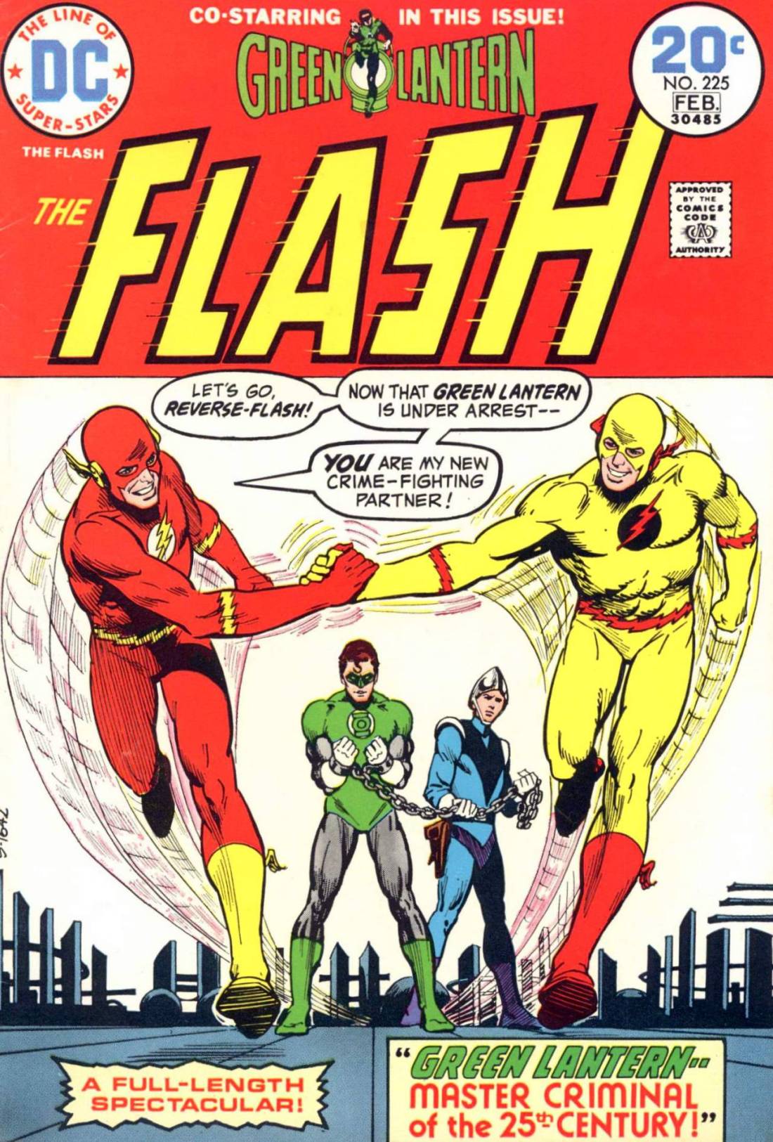 Seeking out Zoom, the Professor agrees to help Flash destroy the rampaging monster–but only if Green lantern remains behind and steals for him a rare sculpture, the Raxalus Wings. Despite his oath as a Green lantern, GL agrees to do so. He power-beams the two Flashes back to 1973 (despite the fact that Zoom’s costume is almost entirely yellow) and moves to go steal the wings–only to be confronted by the Green Lantern of 2473!