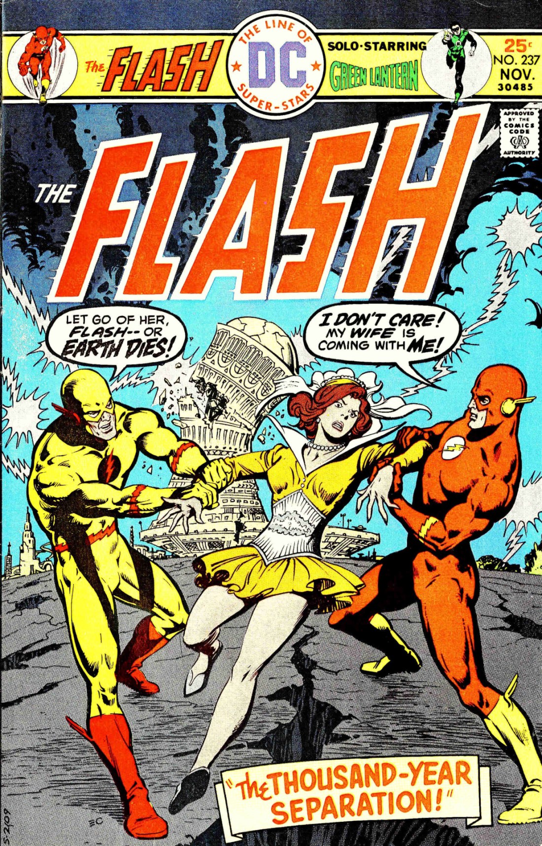 For the third time in a dozen issues, the villain of the day was professor Zoom, the Reverse-Flash. Which I didn’t really mind, I liked Zoom. And clearly FLASH writer Cary Bates liked him as well. This was the issue in which I learned the complicated backstory that had been grafted onto poor old Iris Allen by Bob Kanigher a few years earlier: that she’s really been born a thousand years in the future, and was sent back in time to be raised when disaster threatened her native era. Boy, talk about a strange choice to make–up to that point, Iris had simply been a reporter and a wife.