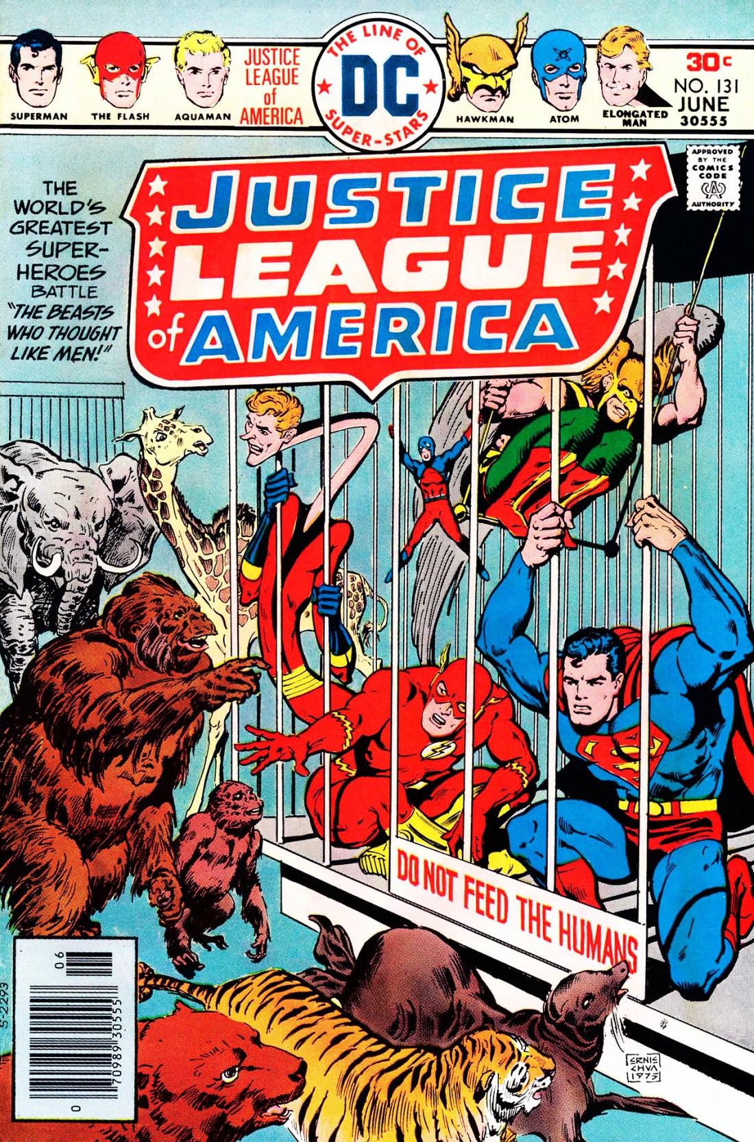 But weeks after that problem is sorted out, seemingly, the Atom and the Elongated Man find themselves facing a crisis in which zoo animals have escaped their cages, as though they were seemingly smart enough to open the locks. Meanwhile, the visitors to the zoo are all too dumbfounded to react, so it’s up to E-Man and the Atom to save the day. Sensing a larger problem in the offing, they send the JLA emergency signal.