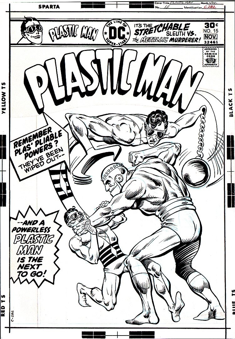 The original art to the cover of Plastic Man #15. Looks like it had been drawn larger and had to be statted down to fit all of the Trade Dress elements in.