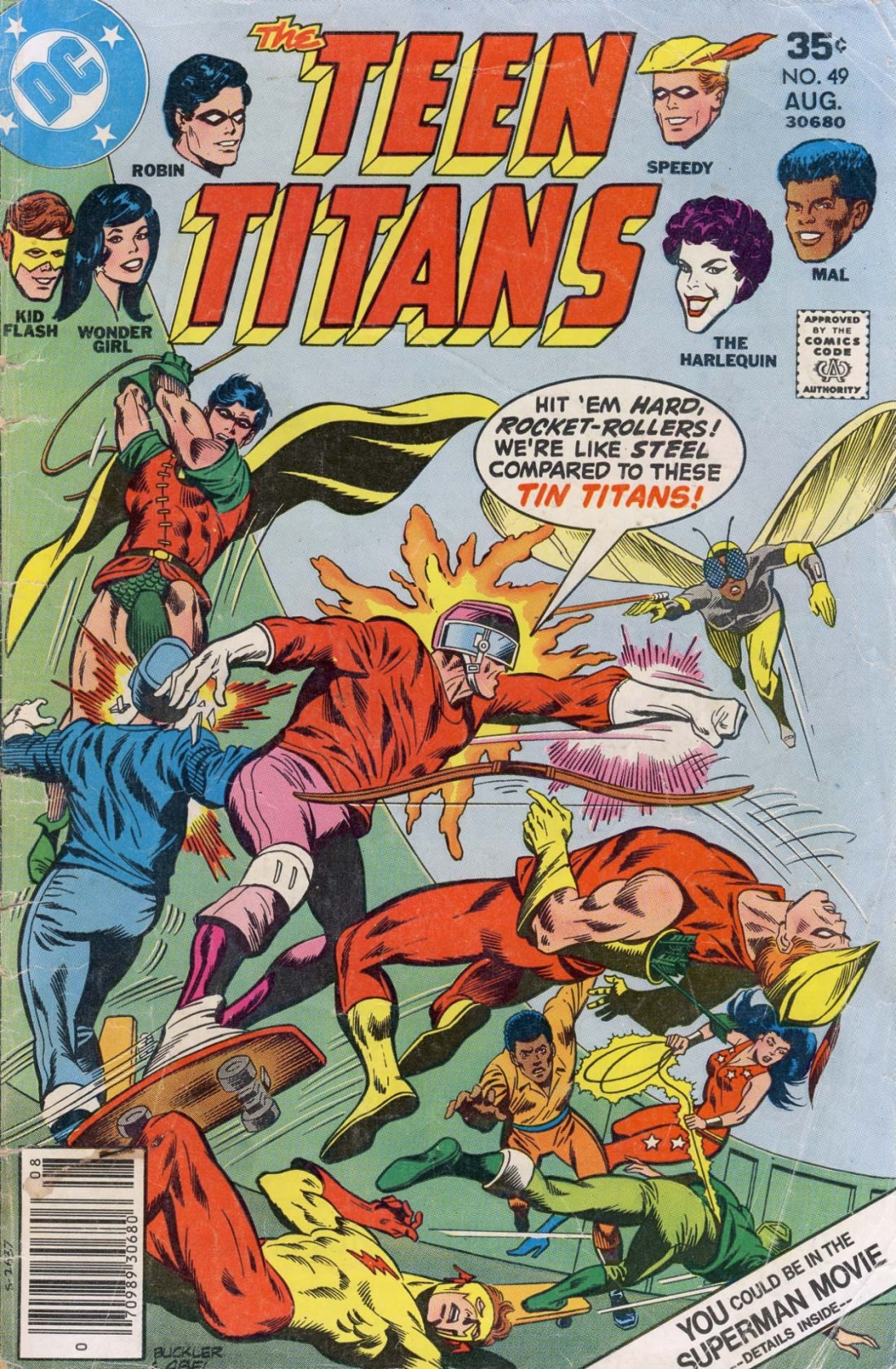 Cutting to the Rollers in their hideout, we discover that they’re a quartet of young thugs given their souped-up skateboards by genius kid Bryan, who blames the popularity of the Teen Titans for why he can’t get a date. Yeah, I know. The four other guys go along with his instructions, but they’ve got a side-operation where they’re robbing the places Bryan tells them to hit as well. A week later, the Titans are putting on a public appearance when the Rocket Rollers attack them again.