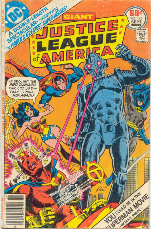 The mailman showed up with my subscription copy of this month’s JUSTICE LEAGUE OF AMERICA, featuring this cover by long-time interior artist Dick Dillin. I remain a fan of Dillin’s work, despite it’s occasional awkwardness–like Irv Novick on FLASH, Dillin defined the look of JUSTICE LEAGUE for me, drawing the series for 12 years solid with only one miss before his untimely death. I do recall that I was a bit unsettled by the bits flying out of the Red Tornado’s eyes and ears, and how the top and bottom portions of Reddy’s insignia-straps seemed way too long given the part that was bursting out of his chest.