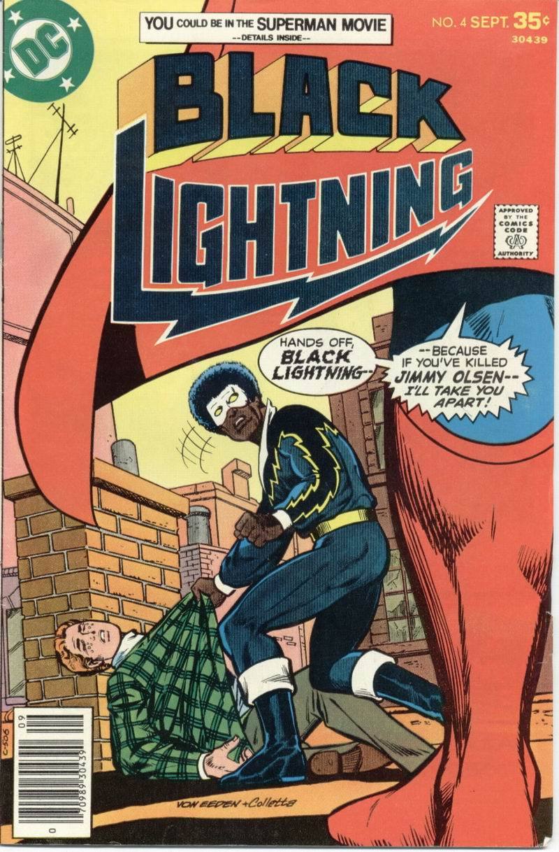 With the villain down, Lightning goes to help the unconscious and badly hurt Jimmy Olsen. But then, in a scene unfortunately spoiled by the issue’s cover a voice rings out behind him, and he turns to be confronted by an angry Superman, who tells him that if Jimmy is hurt, he’s going to take Black Lightning apart. And so, with this dire turn of events, this issue is To Be Continued. As I said at the start, I thought it was a good read, I liked the idea of a new player in the DC Universe, and I was a convert to the series, at least for as long as I was able to get it.