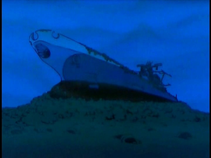 Remarkably, this particular episode of STAR BLAZERS makes no secret of the fact that its signature battleship is the reborn Yamato, although it is the last episode in which that name will be uttered. It’s pretty remarkable, given the time in which the series was brought over, that this identification was maintained–especially given how easy it would have been to get around it. And in fact, the episode opens with an extended replay of the closing minutes of the first episode, in which Wildstar and Venture crash their purloined plane near the wreckage of the ancient warship and speculate about its secret. This was necessary to bring the episode up to the necessary American run-time after the largest single cut made to STAR BLAZERS–the extraction of a three-minute sequence, beautifully and sensitively rendered, depicting the final mission of the battleship Yamato. And it’s really no wonder. Beyond the fact that an American audience would have no cultural touchstone for these events, in the context of the sequence, the American pilots who sink the Yamato are the bad guys, for all that they salute the fallen ship as it goes down.