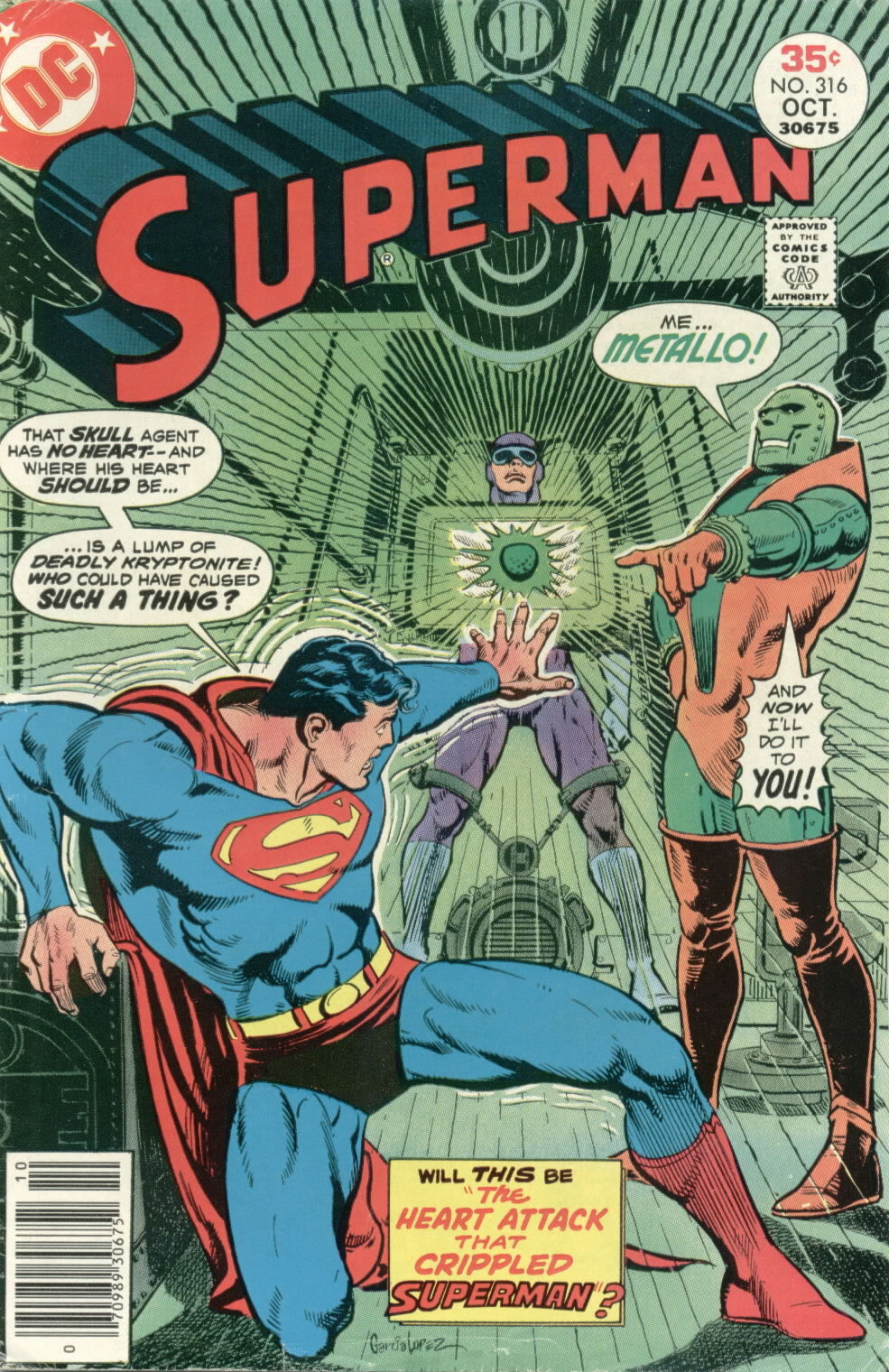 This particular story opens in mid-fight, as Superman attempts to prevent the mysteriously-resurrected Metallo from making off with a meteorite containing Kryptonite, which he intends to use to power his mechanical body. As Metallo makes his escape, Superman muses on what brought him here, and we cut back to the conclusion of the preceding issue, and learn that the Skull agent who seemingly had a Kryptonite heart actually didn’t–it was just ordinary rock made to resemble Kryptonite. Still a pretty spooky calling card, though, and enough to alert Superman that Metallo was back from the dead and back in business.