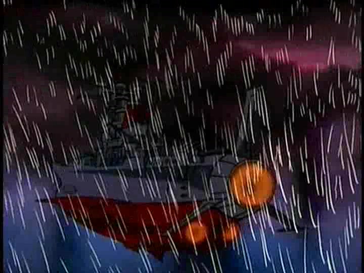 After the standard boiler plate series recap, we pick up with the Argo lifting off our of the sulfuric acid sea on Gamilon, once again leaving its Third bridge behind. For whatever reason, everybody in STAR BLAZERS this episode refers to it instead as the Third Gun Deck–but the situation is crystal clear no matter how you slice it: the environment on Gamilon is rapidly eating away at the hull of the Star Force’s ship, dissolving it. And the enemy barrage is keeping the ship pinned down within the heart of the artificially-stirred weather. They are in trouble.