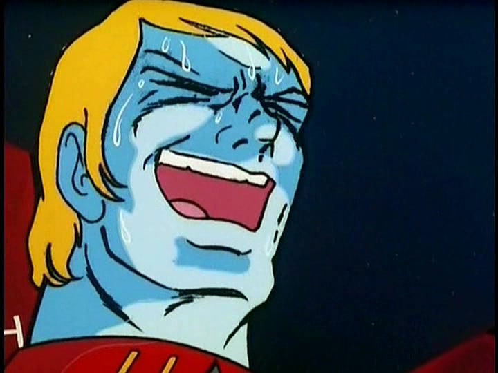The picture goes to black and there is a second of silence, and then we begin to fade back in on the aftermath of the battle as Wildstar recovers his senses. STAR BLAZERS attempts to minimize the seriousness of the moment to say nothing of the bodies that are strewn everywhere in these shots by adding in some chatter over the top of it all from Sandor and Eager. but Wildstar staggers out of the half-destroyed gun emplacement to find Nova weeping on the deck of the Argo. And it’s here that STAR BLAZERS makes a crucial cut–because in the American version, Nova is crying because of all the fighting they’ve had to do, and Wildstar is relieved that the Gamilons have finally stopped. And that’s not what this scene is about at all.