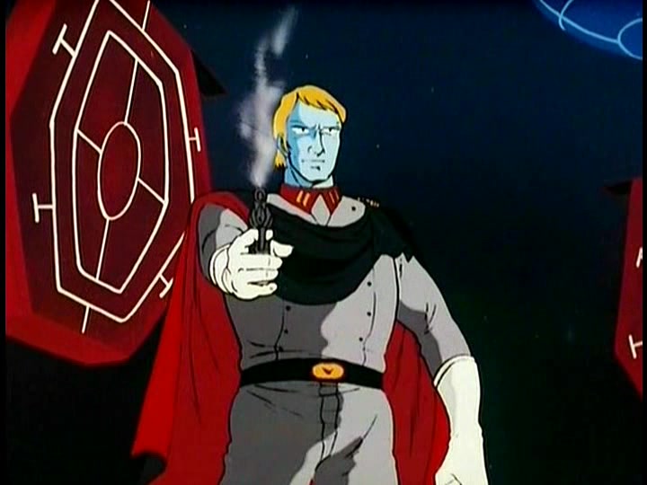 STAR BLAZERS cuts Desslok’s reply (though they do hold on Krypt’s manic pull-in long enough that the moment when life leaves his body is clearly there), but he coldly pulls out his sidearm and executes his loyal General. He can be a hard man to work for, indeed, (In STAR BLAZERS, an earlier bit of footage is dropped in, with Desslok calmly telling Krypt that he doesn’t want to hear such defeatist talk. This, shall we say, lacks punch.)