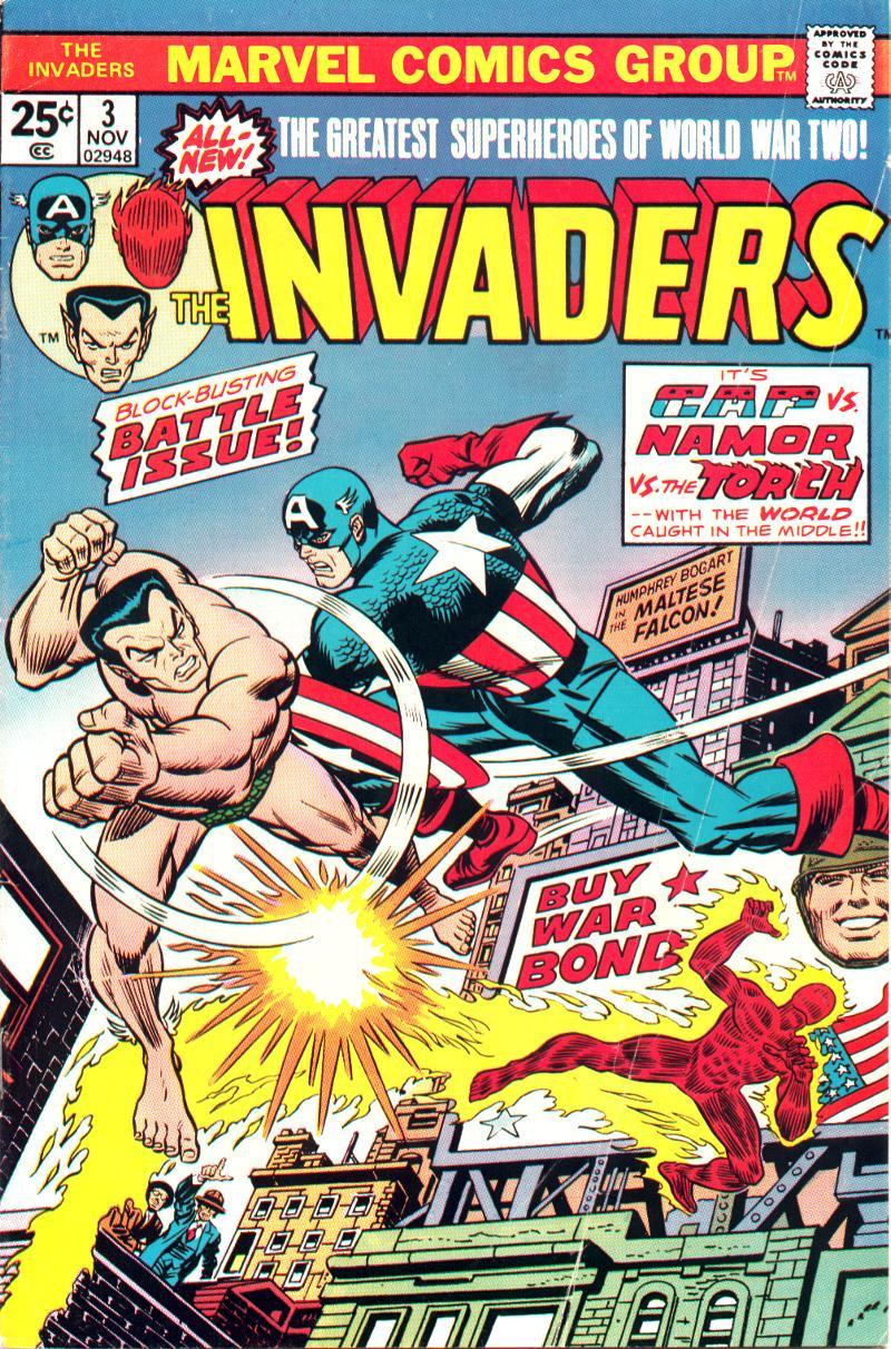 The issue opens with the Invaders returning from the previous issue’s mission, and coming across a U.S. Freighter under attack by a German U-Boat. Leaping into the sea from his flying flagship, the Sub-Mariner makes short work of the attacking sub, while the Human Torch and Toro assist the Freighter’s sailor in putting out the fire on their decks. Namor is able to capture the captain of the U-Boat along with a packet of coded instructions that he is carrying, and the Invaders take them back to Washington DC to decipher them.