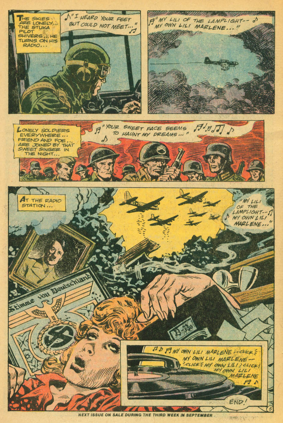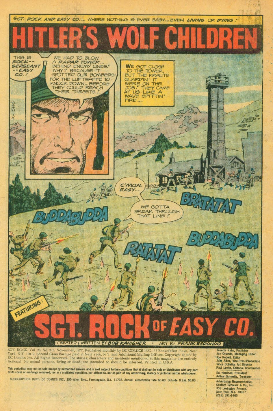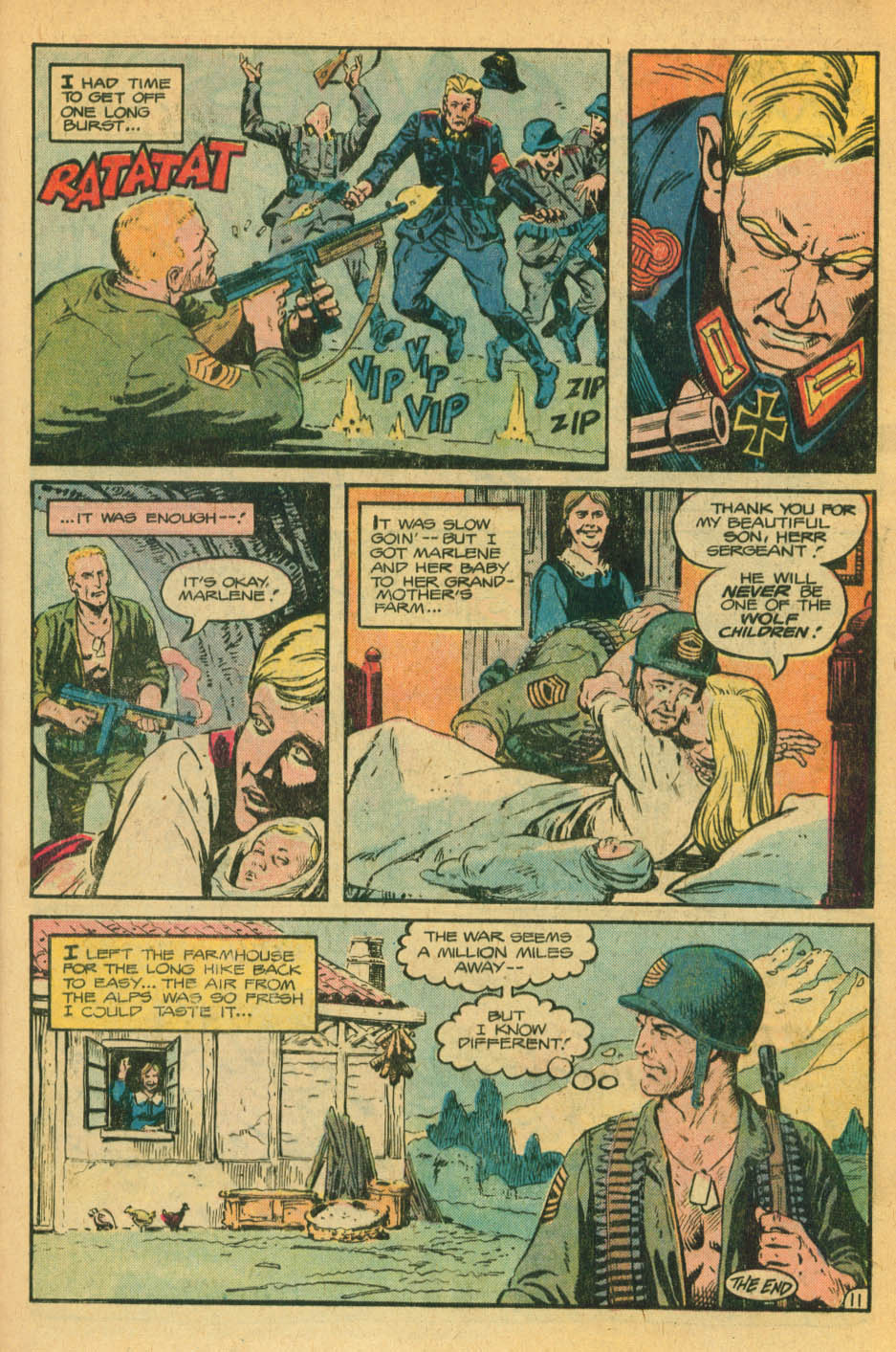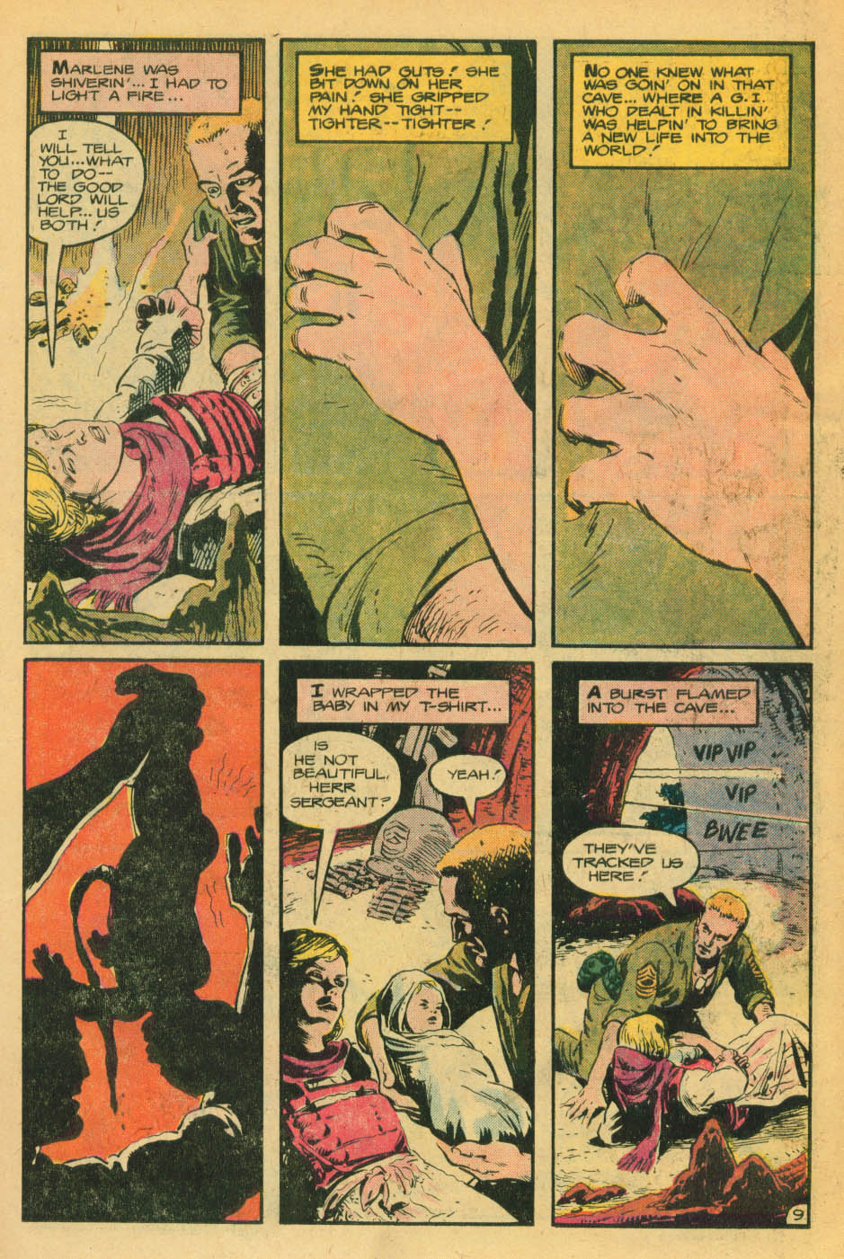 The lead story in this issue opens with Sgt Rock and Easy Company operating behind enemy lines to knock out a radio tower that’s been broadcasting positions to the Luftwaffe. They do so, but not before the Germans get a message out to their nearby forces. Rock orders Easy to split up and make their way back to Allied territory–that together, they’ll be too easy a target to spot. Having done so, the Sergeant begins to make his own way home, and comes across a pair of German soldiers pursuing and firing at a pregnant German girl. Rock can’t sit idly by, so he intercedes, nailing both enemy gunmen.
