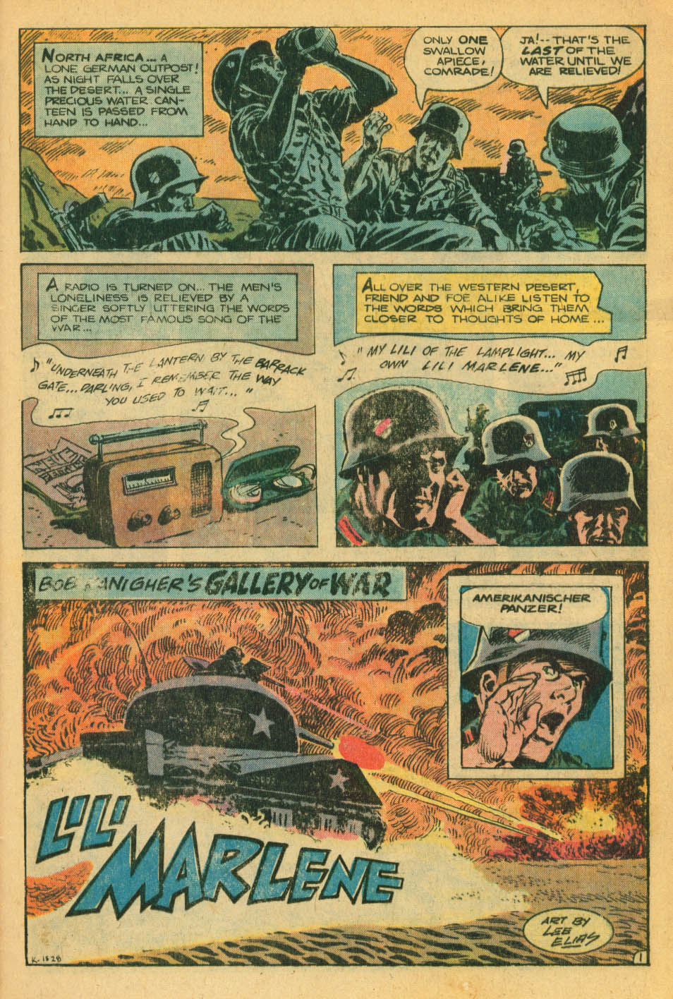 This was followed by a one-page gag strip by Dave Manak. The war, western and mystery books tended to use these sorts of filler bits for years after the super hero titles stopped, mainly because most of the stories that went into these titles could be run in almost any order, and so sometimes hitting the necessary page count required an additional page or two. This was followed by a short story in the Bob Kanigher’s Gallery of War series, this one illustrated by the reliable Lee Elias.