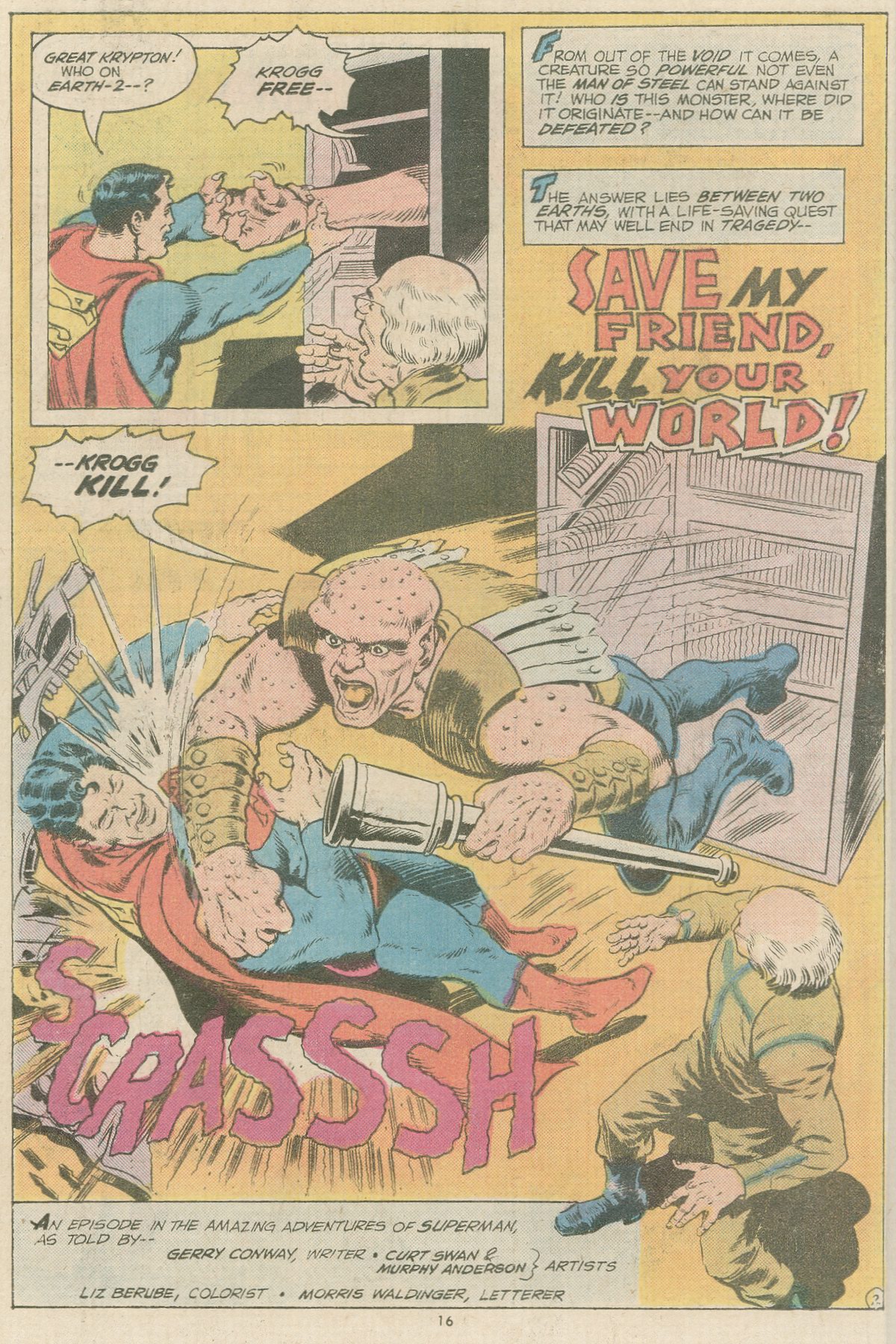 Now, the story I picked up this issue of SUPERMAN FAMILY to read was this one, a Superman adventure by Gerry Conway and Curt Swan, the first of two parts, which teamed up the familiar Earth-1 Superman with his older Earth-2 counterpart. I was already a sucker for the Earth-2 concept, so it was easy to draw me in with those original super heroes in any story. In this one, the Jimmy Olsen of Earth-2 needs an organ donor, and not finding one on his Earth, the Superman of Earth-2 realizes that he could get one from the Jimmy of Earth-1. Unfortunately, on Earth-1 professor Potter is messing around with the JLA’s interdimensional transporter, resulting in not Superman-2 but a giant beast-man called Krogg coming through the dimensional barrier. Krogg proceeds to kick the hell out of Superman–but just as things look worse, the Earth-2 Superman makes his way across the breach and issues challenge! To Be Continued!
