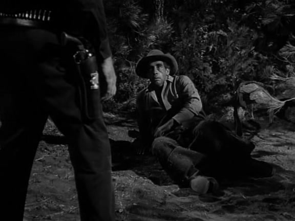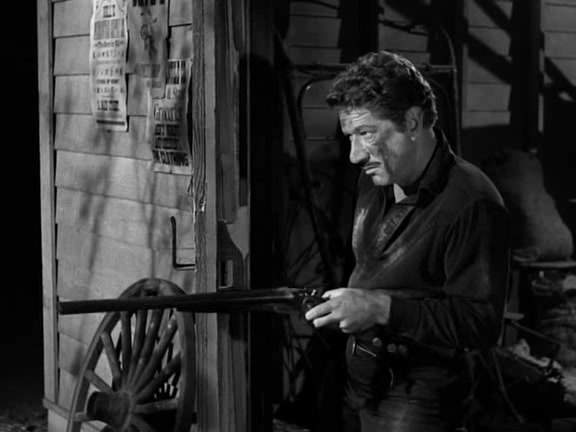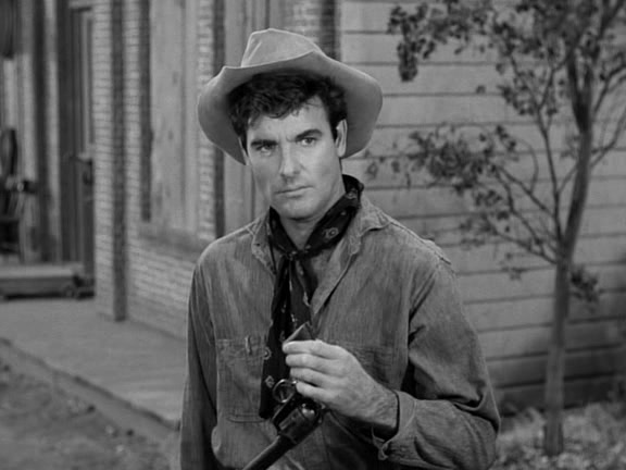 By the next morning, Paladin has been unable to locate Roy, and Dot comes to once again try to talk Paladin off, to no avail. And so, Roy emerges from hiding to confront his pursuer. “Now look, Paladin, I’m sick to death what we done last night. But you ain’t gonna put those leg chains on me. You wanna take my life away? Then you go ahead and try.” Paladin replies, “I don’t want your life. I don’t want revenge. You turn yourself in to Remy and I’m done with it.” And then Paladin throws the telegram he received down on the ground in front of Dot.