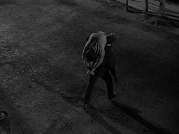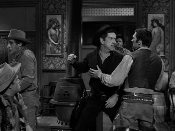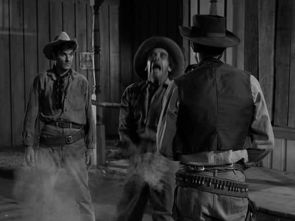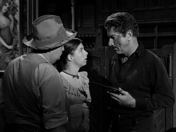Trouble starts when a quartet of local cow-punchers roll into town and end up in the restaurant along with Paladin and Kincaid. They’re bored and restless, and they wonder aloud why, given that Kincaid pays the same bounty dead or alive, Paladin bothers with transporting him. Paladin makes his position clear to the four men: he will not give his prisoner up, especially not so that they can entertain themselves by hanging him. There’s a lot of hate to go around here–the hate the cattle-men have for sheepherders, that they have for Mexicans, and even the self-loathing of one of their party who is a quarter Apache, and afraid that others will view him as such. Of the four, the most capable is Roy, Dot’s boyfriend, who’s won gunfights before, but who goes along with the others simply because they’re his friends. (Roy is played by James Best, who years later would be Sheriff Roscoe P. Coltraine on The Dukes of Hazzard, which is a little bit strange.)