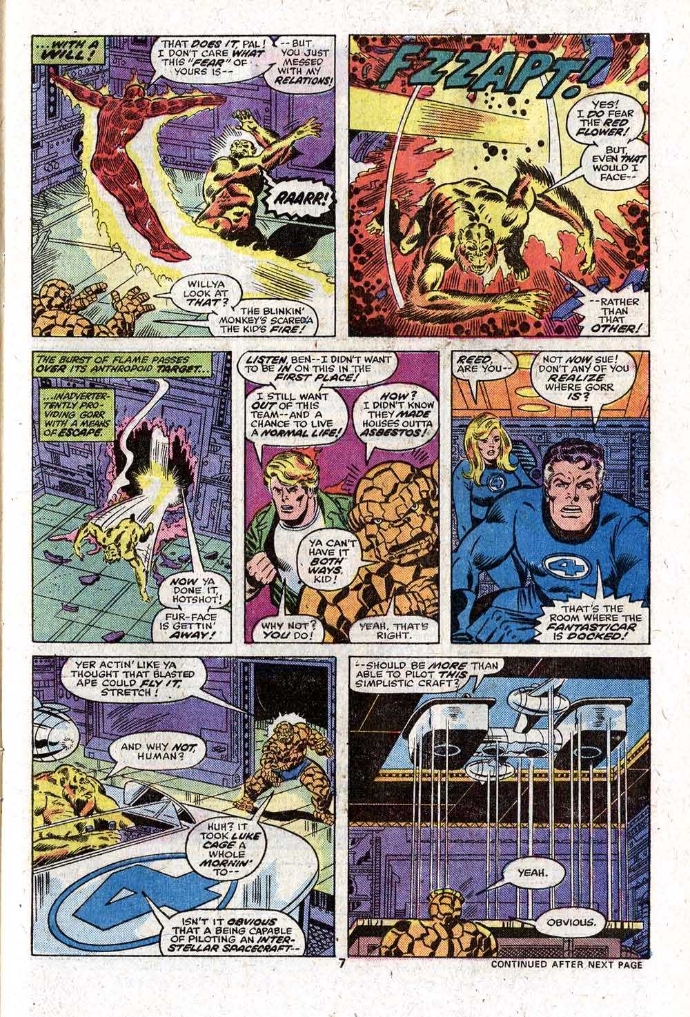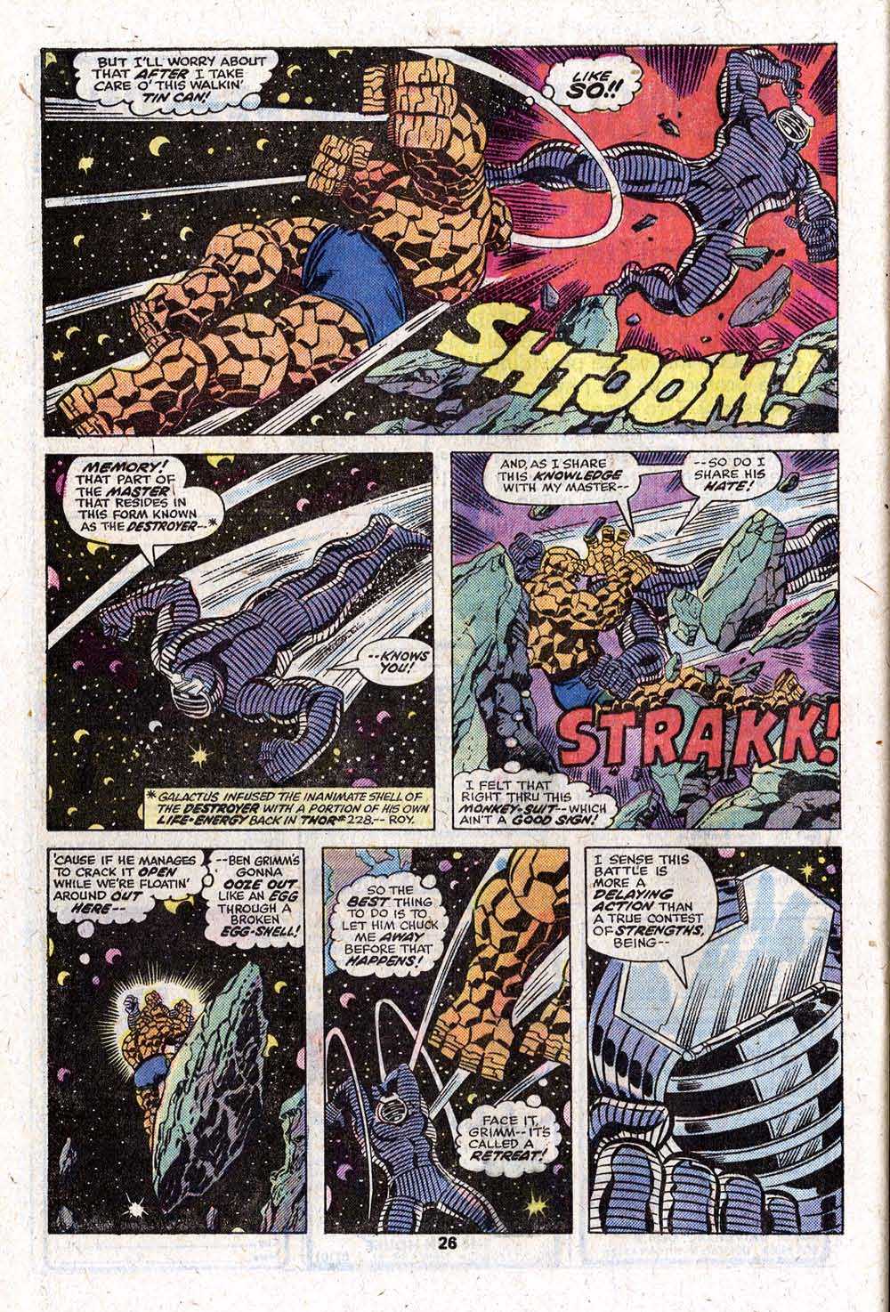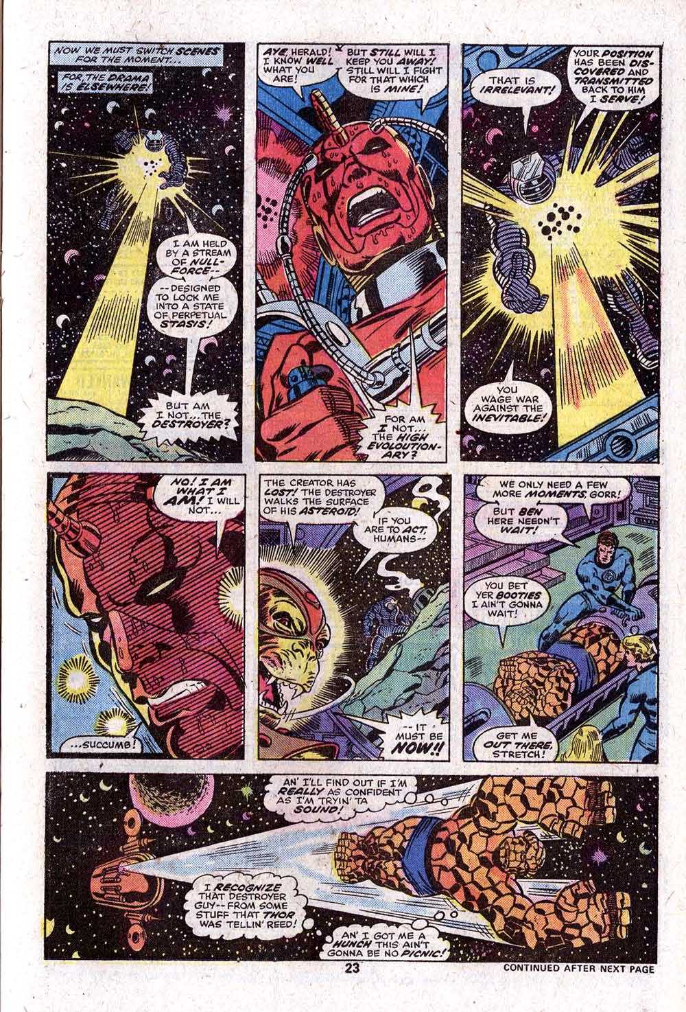 And so we move into a couple pages where the Thing and the Destroyer have a big ol’ fight. This was very much the pattern in the Marvel books of the day–the fights tended to be pretty interchangable but they were also often the whole of the plot. Here at least, George Perez and Joe Sinnott make everything look good (this is a very nice looking issue all throughout, actually) but exactly why the Thing is fighting the Destroyer is unclear–he’s already sent the signal that will summon Galactus, and nothing Ben does here is going to change that.