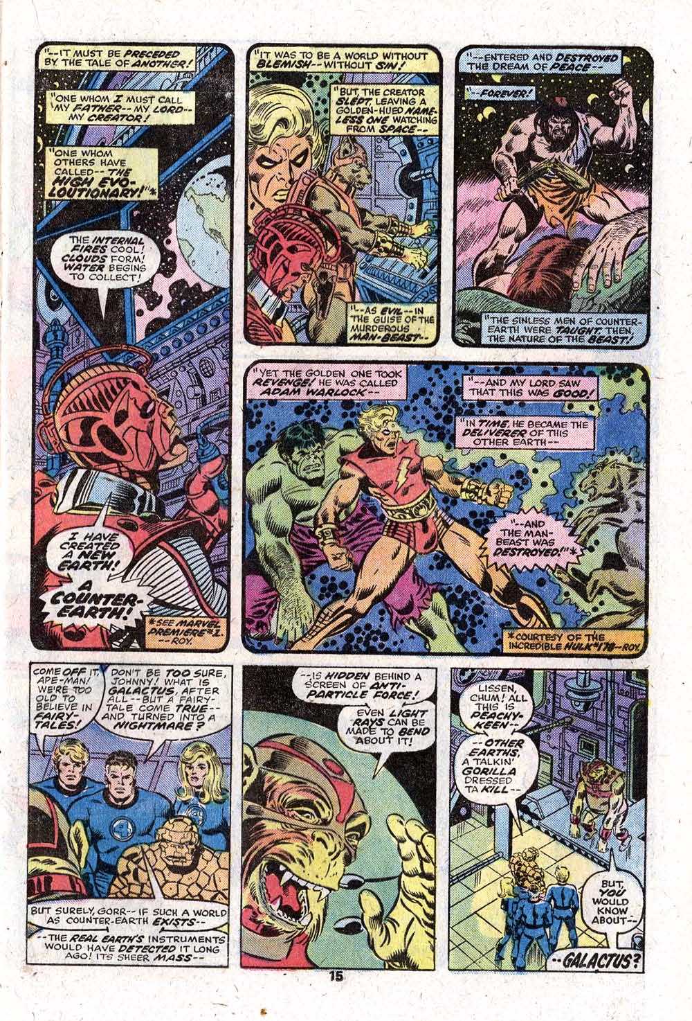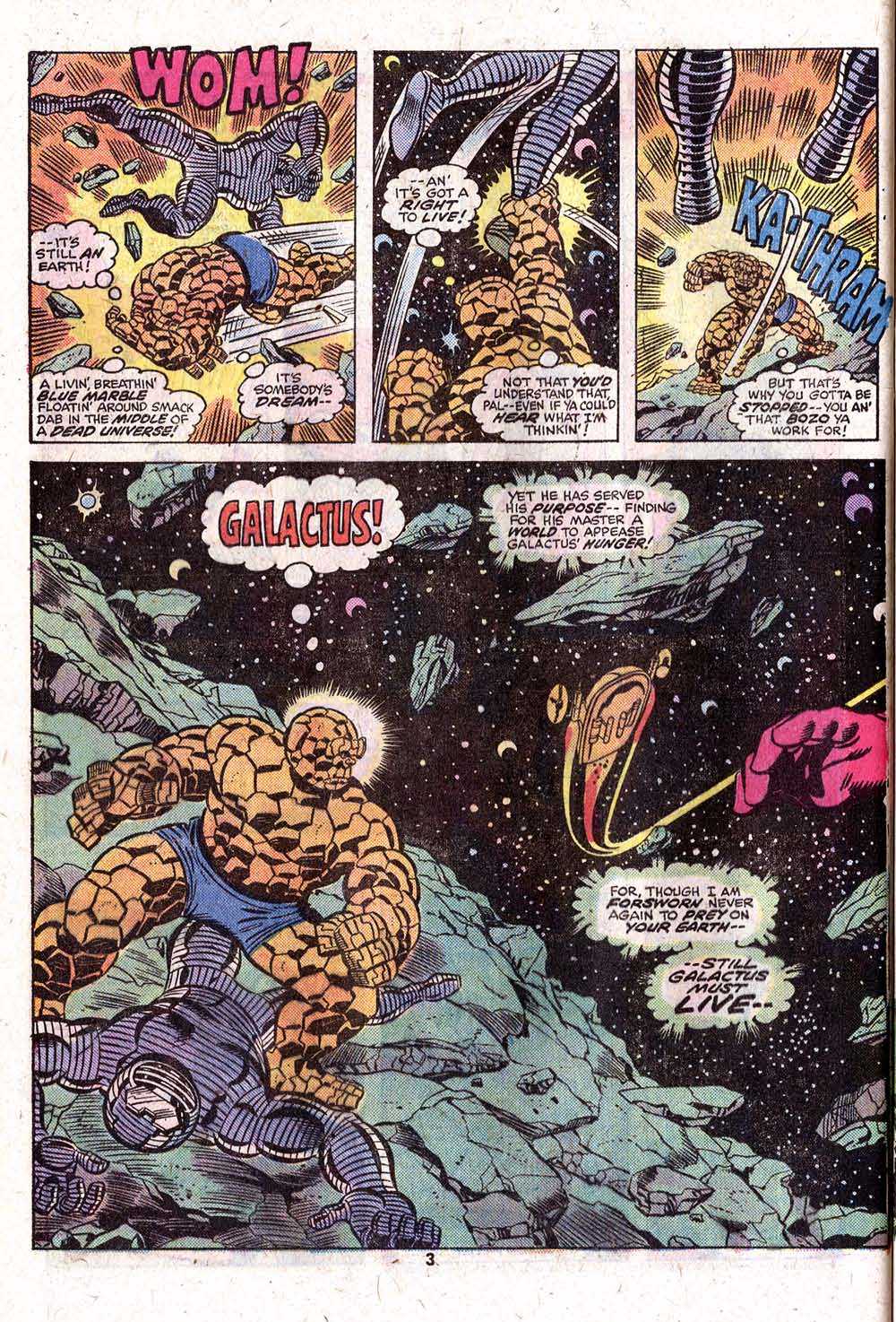 Ultimately, the Thing does wind up kayoing the Destroyer–or so it seems for a moment. What’s actually happened is that Galactus has removed that small part of his essence from the Destroyer, needing his services no further at the moment. And we get our first real glimpse of Galactus is a wide spread shot, emphasizing his colossal stature, as he declares that Counter-Earth is doomed! To Be Continued!