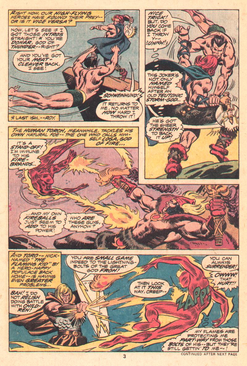 The Invaders are on the hunt for a Nazi operative called Brain Drain. Along the way in their search, they rescued an amnesiac young woman who possessed a strange ring. But then, Namor’s flagship was knocked out of the sky by a thrown axe and the Invaders found themselves in battle with three would-be Teutonic Gods: Donar, Loga and Froh.