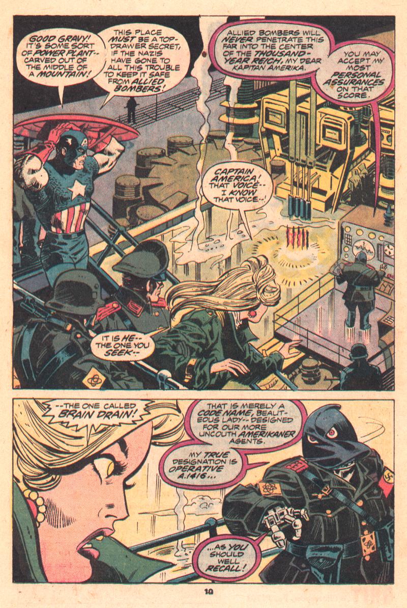 Meanwhile, Captain America and the lady Hilda seek shelter in a nearby cave, unaware (in the tradition of countless Joe Kubert war covers–Roy even makes an editorial joke about it) that there is a battalion of enemy soldiers already in that position. Cap and Hilda are taken prisoner and marched into a secret base within the mountain, the lair of Brain Drain.