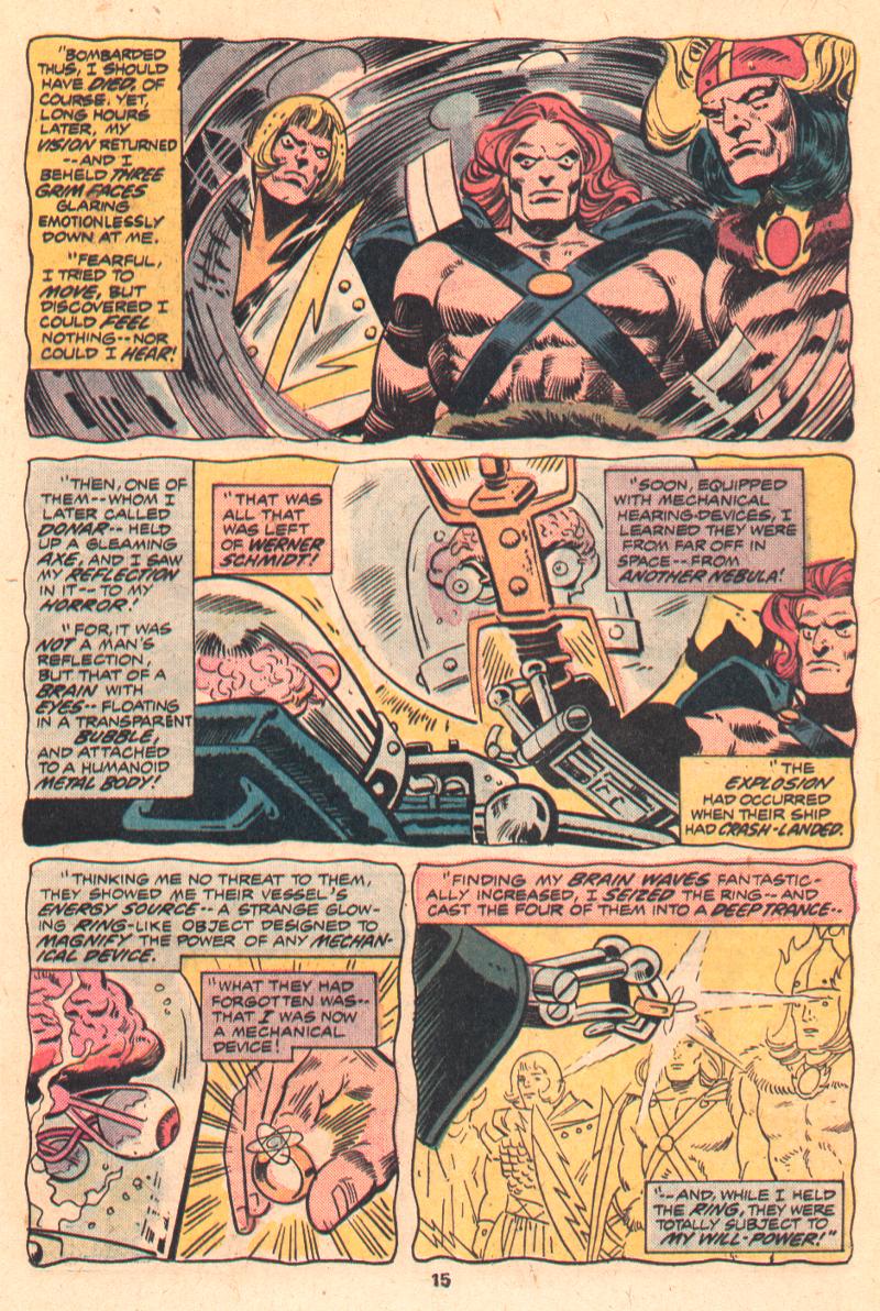 Cap takes a swing at Brain Drain, revealing that he’s a cyborg, literally a brain in a jar with eyes. Subduing Cap with his mental might, Brain Drain reveals his origin. he was on the site of a crashing spaceship, which devastated his body. The aliens put him back together as best they could. but Brain Drain seized the ring that was the power source of their ship and used it to brainwash the four aliens into believing that they were Teutonic Gods come to help the Axis cause. But Brunnhilde was stronger of will and she escaped with the ring, albeit with no knowledge of her true self.
